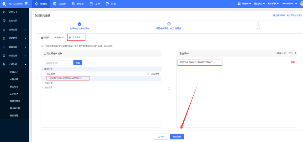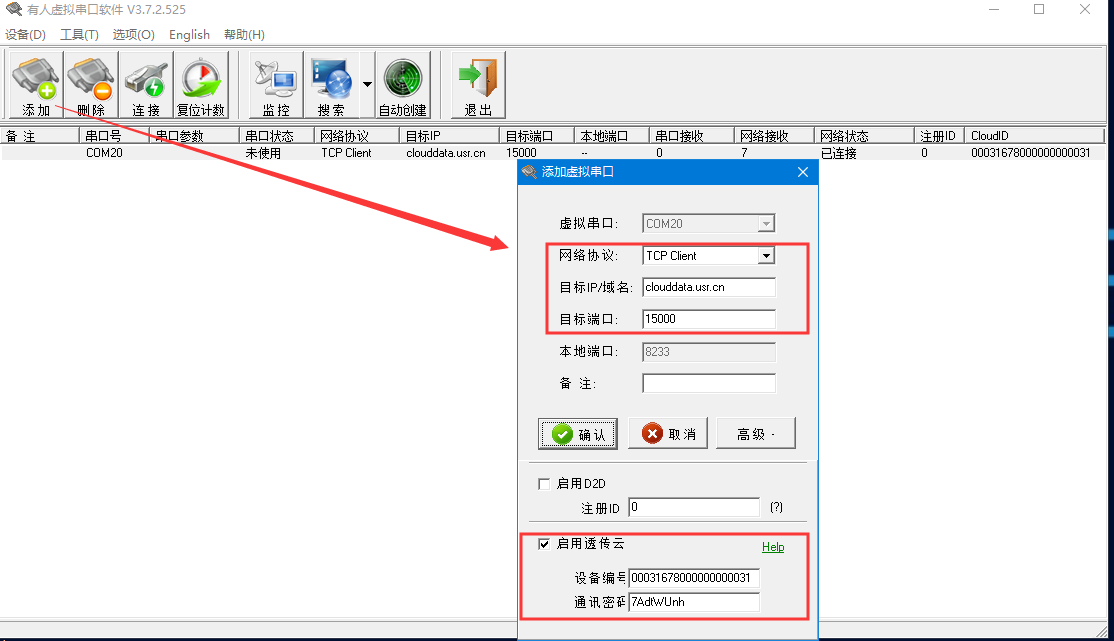 点击添加——选择虚拟串口号——网络协议tcp client ——目标IP/域名clouddata.usr.cn——端口15000——启用透传云——将云端生成的虚拟串口的设备编号和通讯密码复制到参数区,点击确认;可以看到虚拟串口在有人云上线