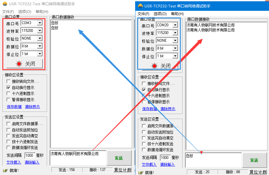 打开两个USR-TCP232-TEST网络助手,左侧串口部分用COM3和虚拟串口COM20打开,串口参数和734设置一致。