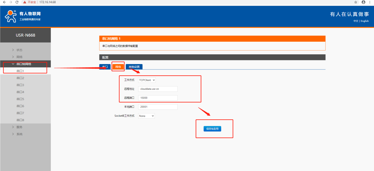 7. 设置端口1的参数,工作方式选择TCP Client,远程服务器地址:clouddata.usr.cn,远程端口:15000,本地端口不要设置为0,默认即可。