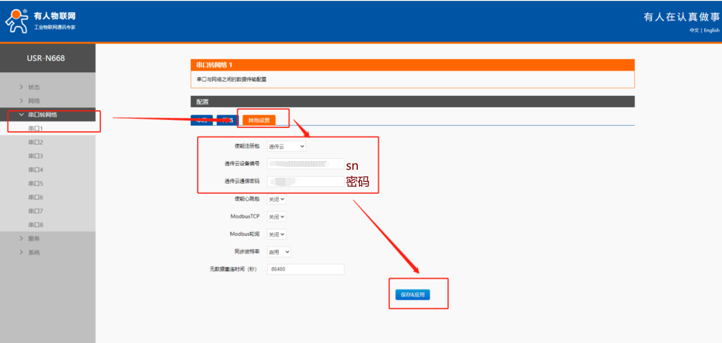8.注册包类型选择透传云,设备编号和密码填写为在云端添加设备生成的设备编号和密码(SN与密码可以通过操作按照图示下面的案例获取)(图片中的为测试生成的,请填写自己的设备编号和密码)设置完成后点击保存应用。