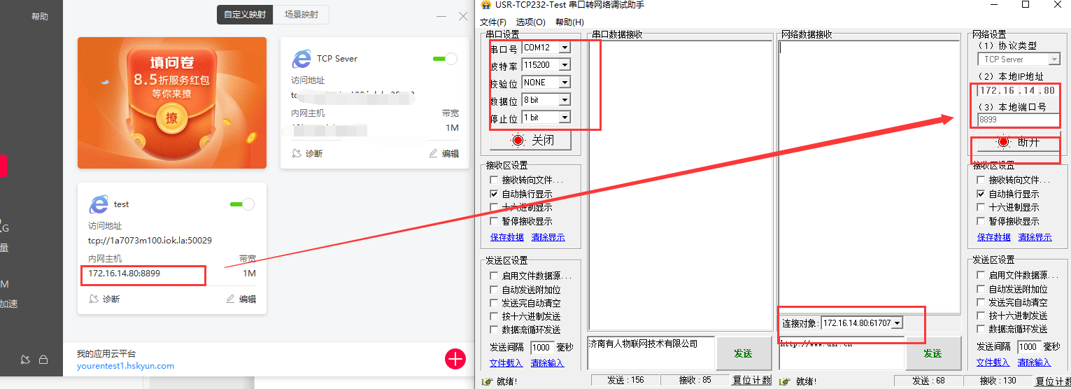 10.使用有人Test调试助手软件测试GPRS DTU串口到网络数据收发情况