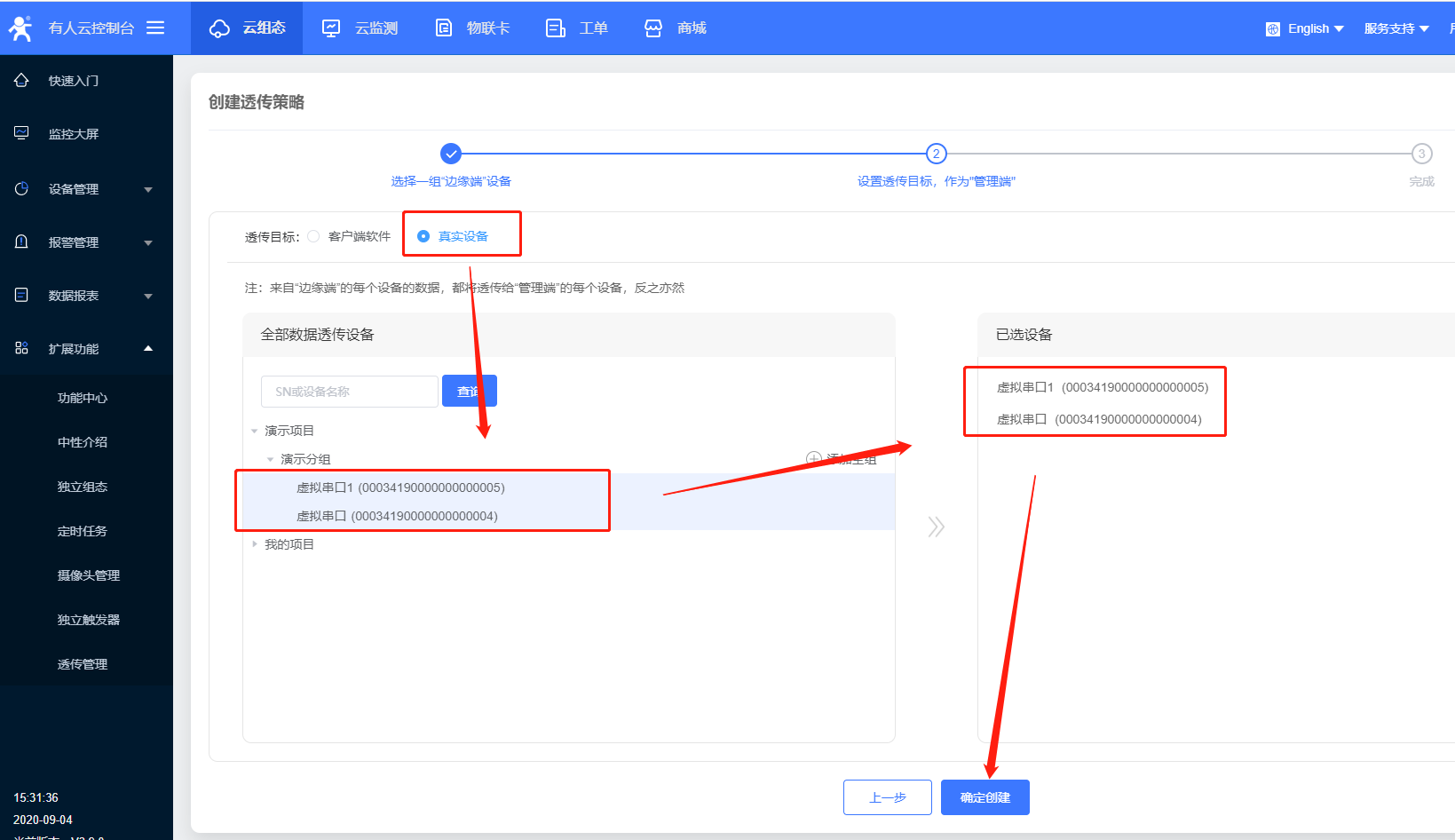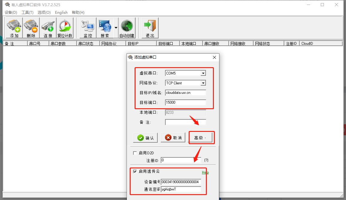 6、启用注册包类型选择透传云,设备编号和通信密码为在云平台添加设备生成的设备编号和通信密码,点击确定设置所有参数。