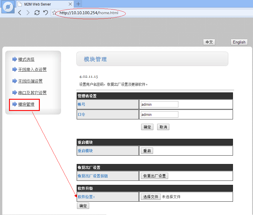 2:浏览器进入模块默认网页 10.10.100.254 用户名密码 都是 admin