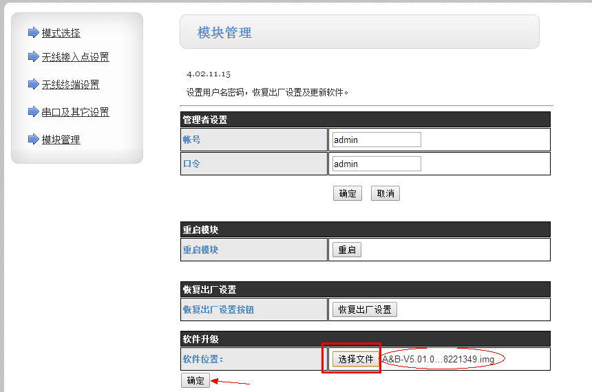 5:刷新页面后显示升级后的页面,然后点击“模块管理” 的 "恢复出厂设置"