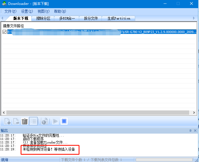 7、出现“未检测到有效设备!等待插入设备”时,断电重启模块(拔掉电源再插上),等待固件下载完成即可