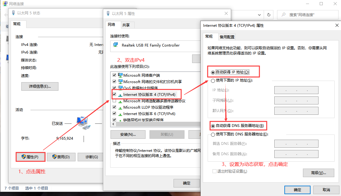 电脑配置网卡,双击该网卡选择属性,双击IPv4进入配置界面,勾选动态获取之后点击确定