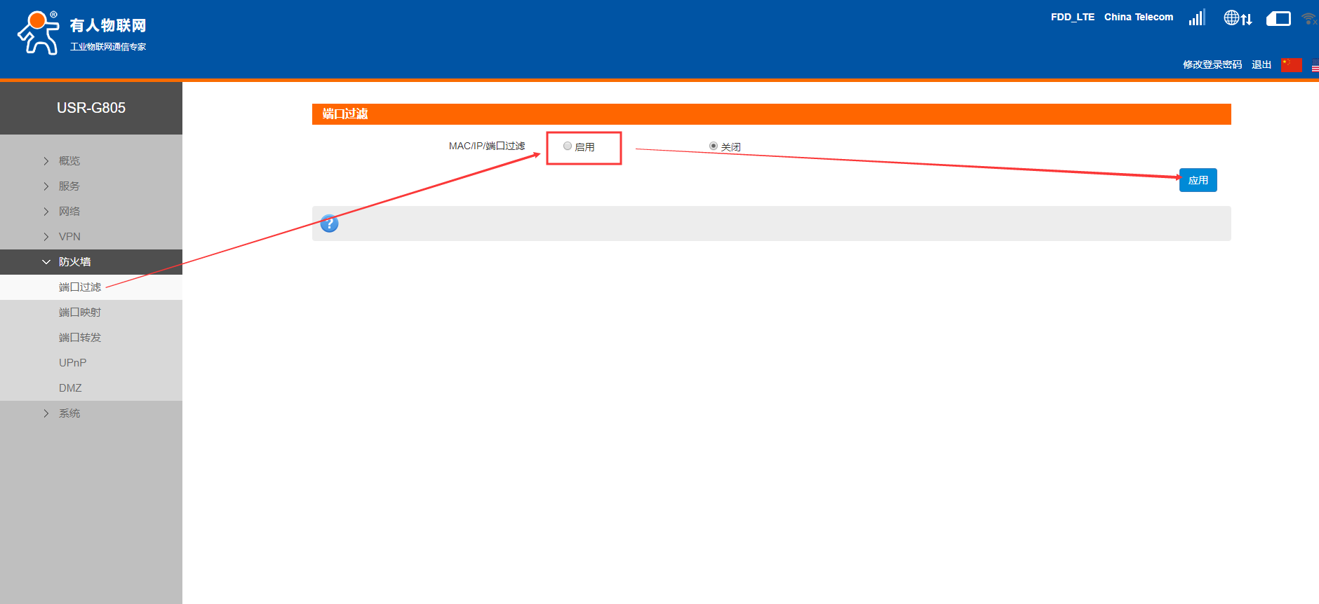 4. 在内置网页--防火墙中端口过滤界面进行设置,启用此功能之后点击应用。