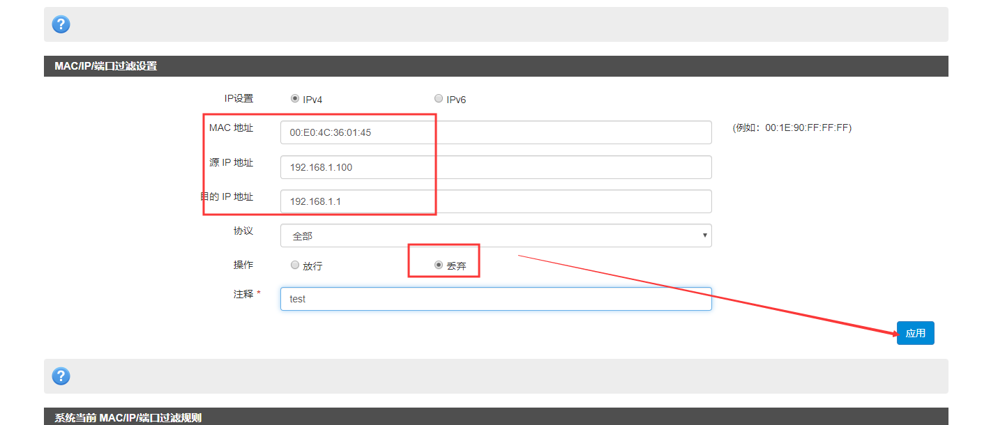 5.MAC和源IP地址设置连接805 的下级终端的MAC和IP,目标IP设置禁止访问的IP,协议选择全部,操作设置丢弃。
