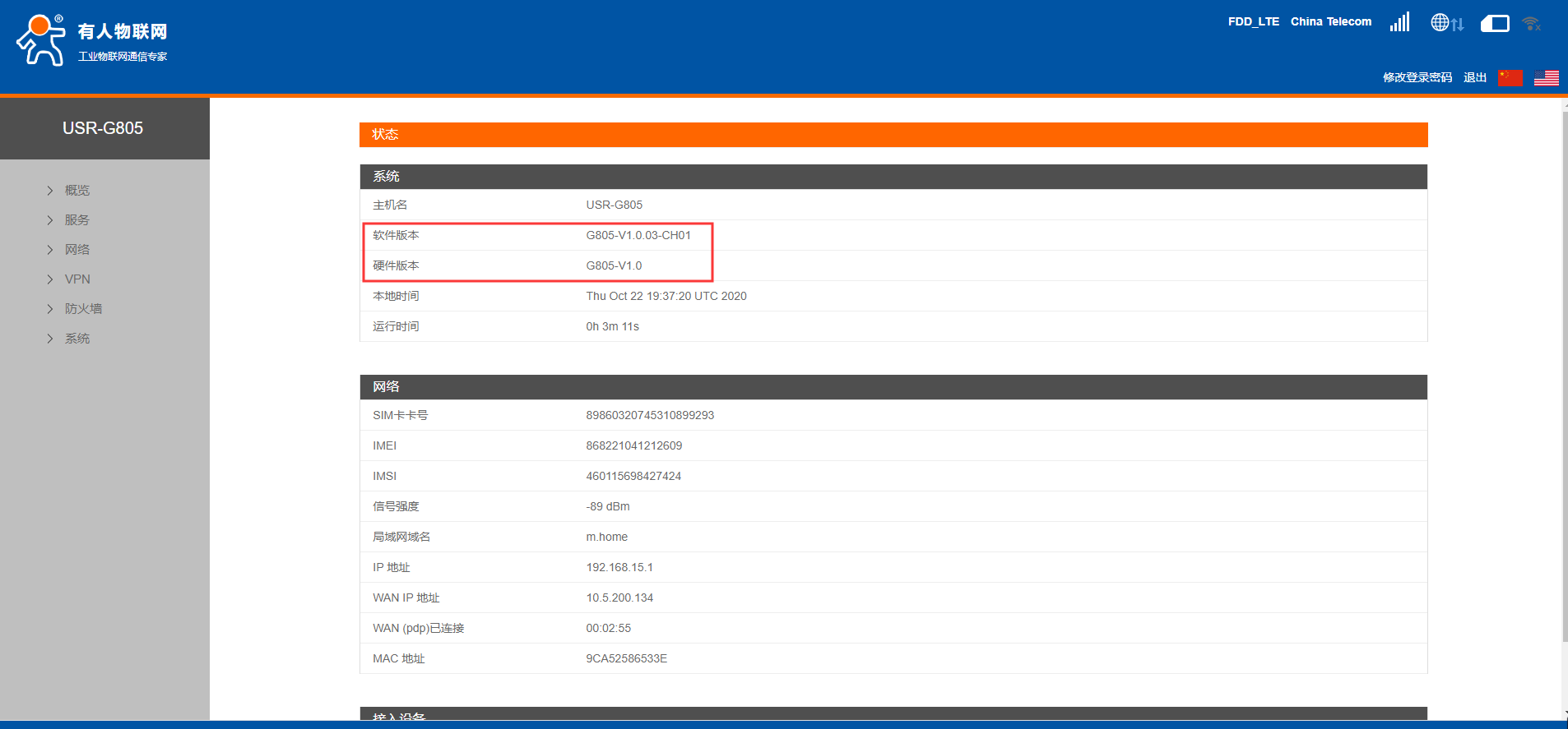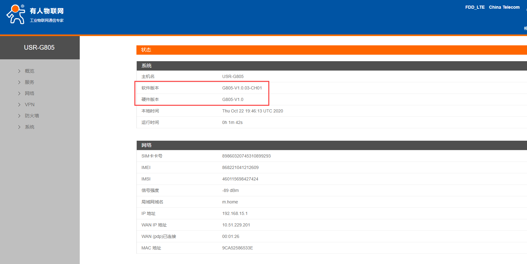 4.在概述--状态界面可以看到硬件版本V1.0,软件版本号为V1.0.03-CH01,现在将模块固件升级为V1.0.06-release