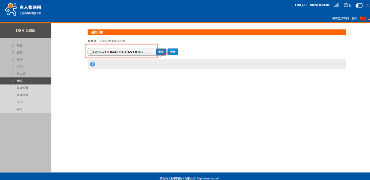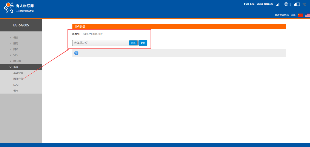 6.点击浏览选择电脑中要升级的固件文件(如需升级,请在客户支持中心提交工单,备注当前固件版本,技术支持会将固件以邮件的形式发送),选择无误后点击更新