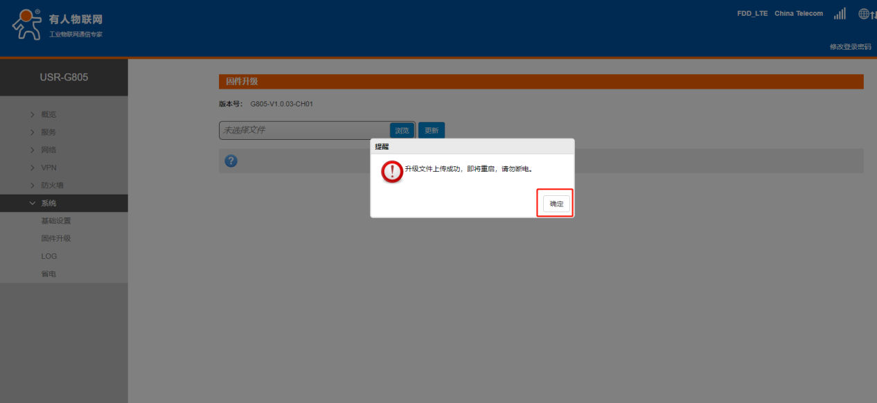 7.文件上传成功后,会收到模块即将重启的提示,点击确定。在升级过程中请勿关闭电源。(升级过程中设备断电会造成死机,无法使用)
