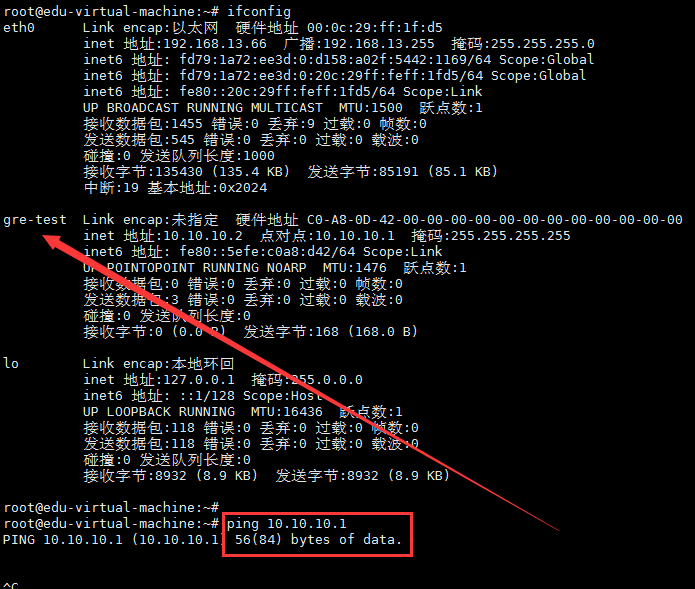 执行完后,ifconfig看一下已经出先一个gre-test网卡,但是这个ping 10.10.10.1是不通的