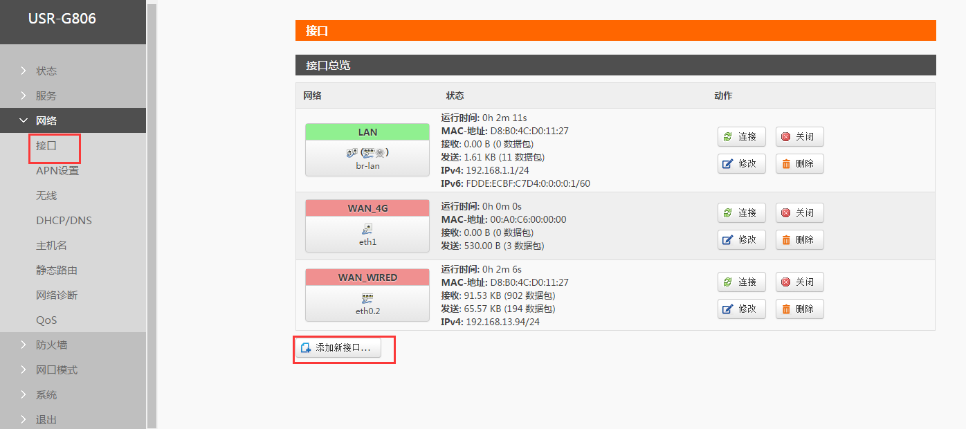 进入内置网页,点击网络--接口界面可以看到路由器现有的接口,这是三个接口不能随意删除,若不小心删除可以将设备恢复出厂设置。