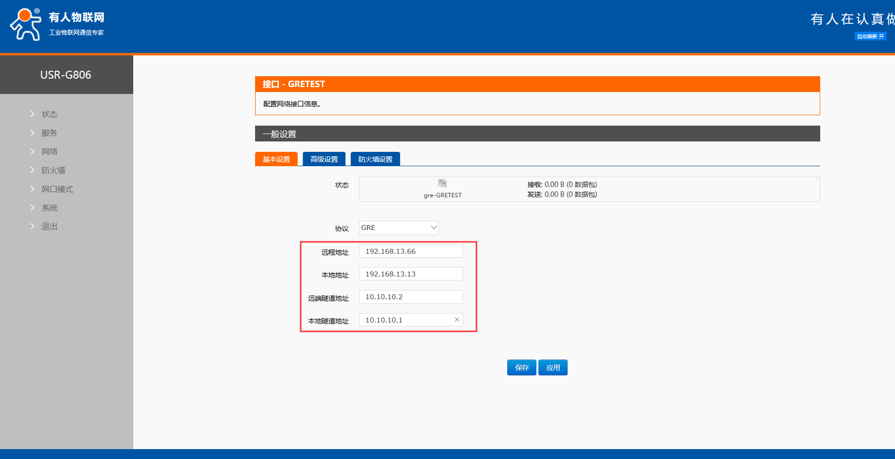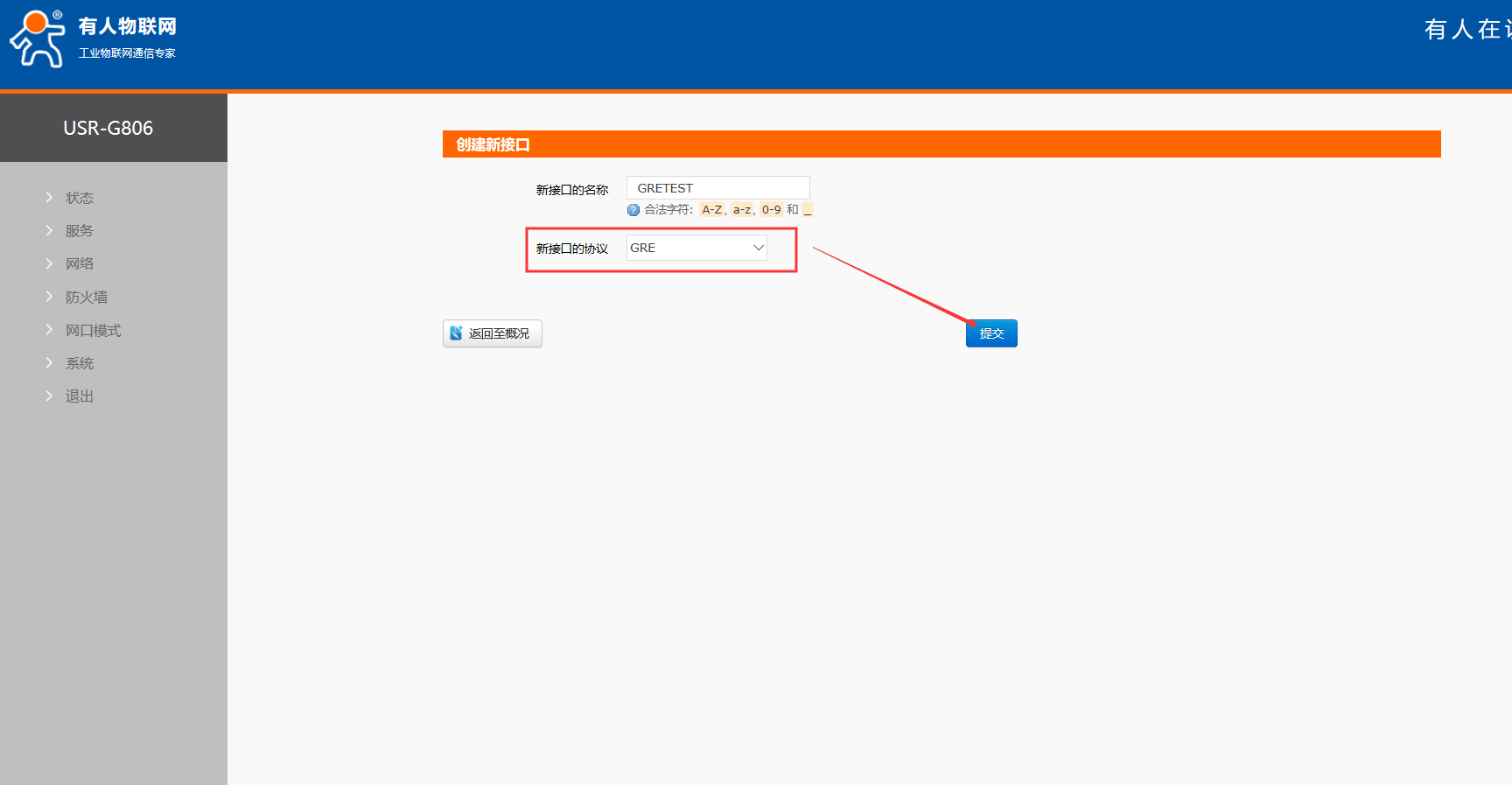 (3)选择添加新接口,名称可自定义,协议选则GRE,之后提交