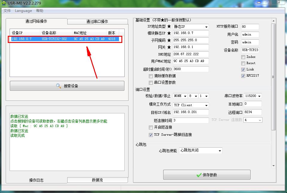 用M0设置软件搜索设备,获取302 的IP参数