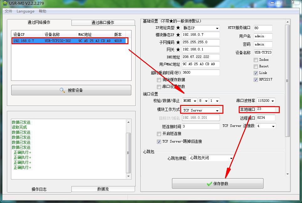 点击302的IP,将302IP设置192.168.0.7,工作方式TCP server,本地端口23