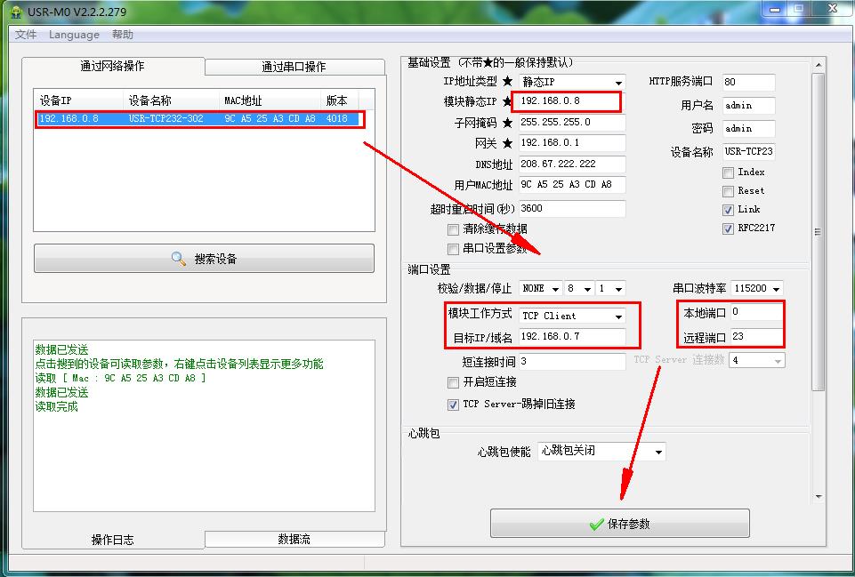 用M0配置软件搜索设备,设置参数之后,2个USR-TCP232-302网线直连,或者都接同一个交换机。