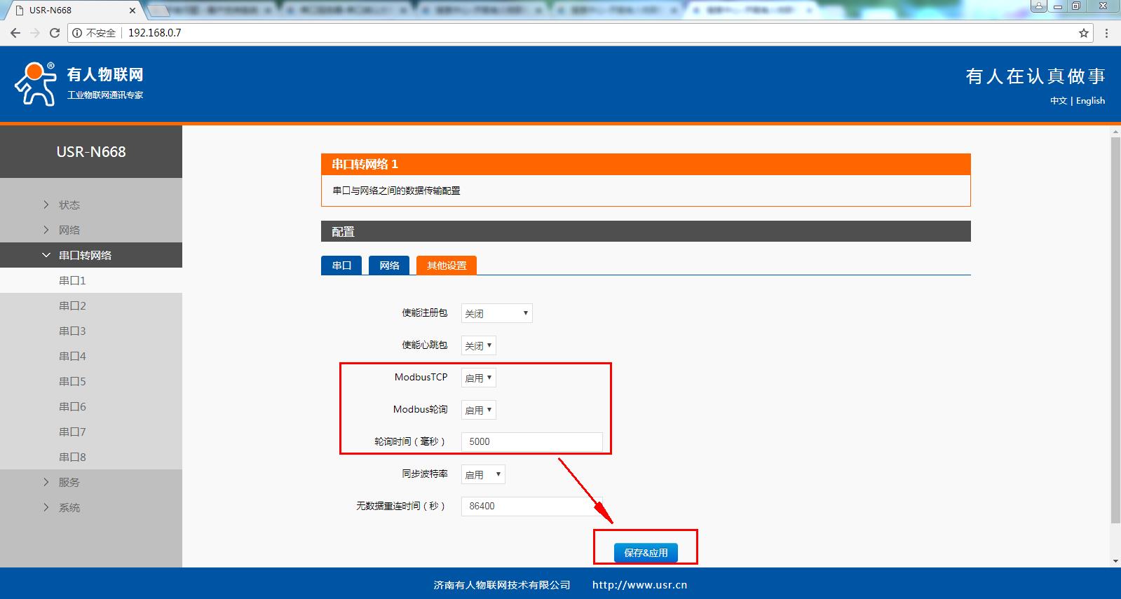 将N668串口一参数,设置TCP server。开启MODBUS TCP功能,开启MODBUS轮询功能,时间设置5000ms。