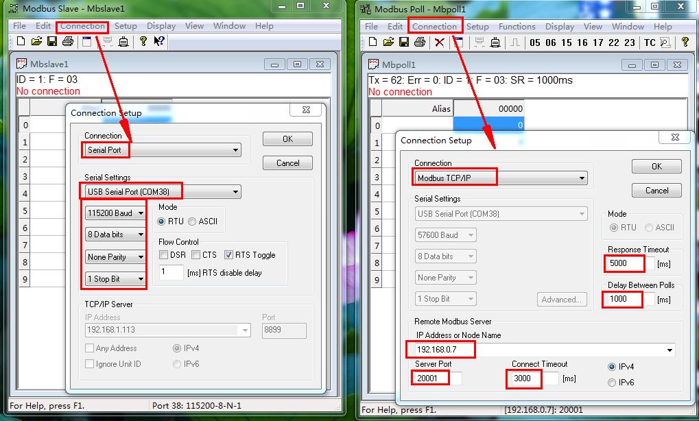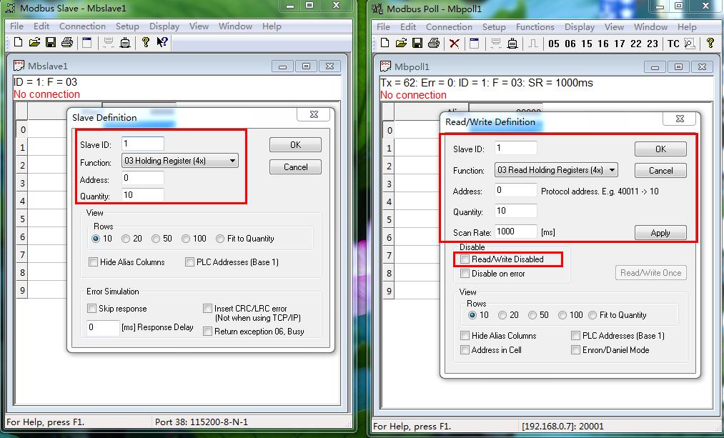 2、MODBUS SLAVE软件和MODBUS POLL软件参数设置