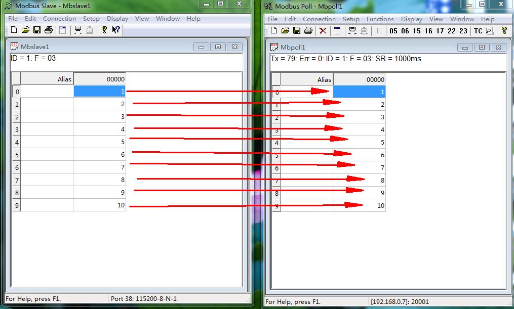 MODBUS SLAVE软件改变从机ID 1 的寄存器地址0-9的内部数据,MODBUS POLL软件对应读取从机寄存器数据。