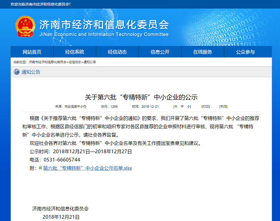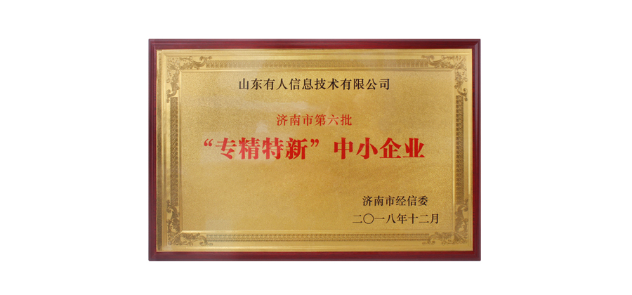12月21日,有人物联网荣获由济南市经济和信息化委员会评选的“第六批专精特新中小企业”称号。