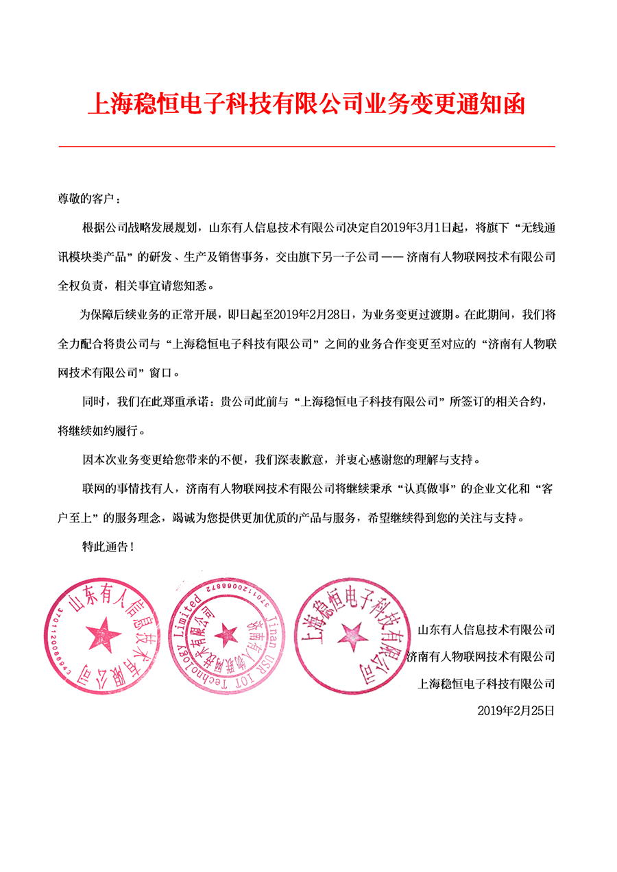有人科技子公司上海稳恒电子科技业务变更通知函