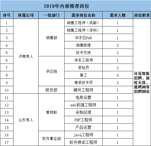 有人物联网开启新年招聘计划,有需要的童鞋可关注公众号“有人物联网”,或前往智联、无忧、猎聘等招聘网站了解详情。