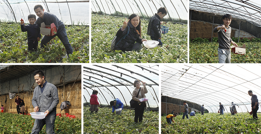 农业大棚里,大家一边摘草莓一边互相交流,充分感受清新的田园气息。在采摘草莓、品尝鲜果乐趣的同时,陶醉于春意萌动的生机。