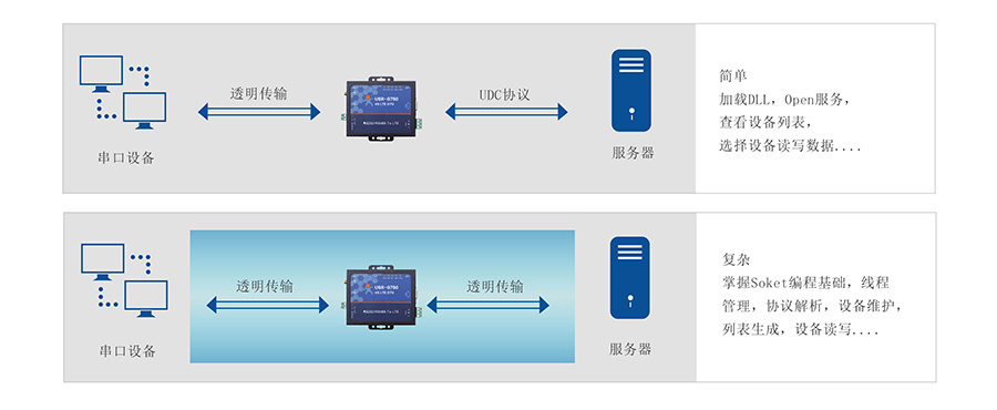 4G DTU在此工作模式下,网络透传模式上增加特定的注册包和心跳包,并且对数据进行组包。这种模式更方便用户使用和二次开发,用户可以理解成加入 UDC 协议的网络透传模式。此模式下,我们提供了服务器端二次开发包,用户在将链接库加入到自己的工程后,就可以通过调用我们提供的接口,快速开发自己的服务端,好处在于设备的上线情况和数据传输既能被用户所掌握,也可以由用户来控制,既方便了用户开发,也提高了服务器端的统一性,稳定性和可靠性。