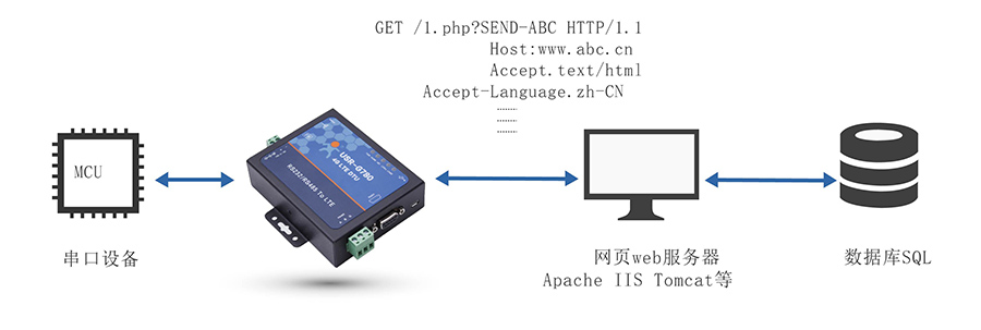 4G DTU在此工作模式下,用户的终端设备,可以通过本设备发送请求数据到指定的 HTTP 服务器,然后设备接收来自 HTTP 服务器的数据,对数据进行解析并将结果发至串口设备。用户不需要关注串口数据与网络数据包之间的数据转换过程,只需通过简单的参数设置,即可实现串口设备向 HTTP 服务器的数据请求。设备默认会过滤接收到的数据,只将用户数据部分输出到串口,客户可以使用 AT 指令选择是否过滤 HTTPD 数据。