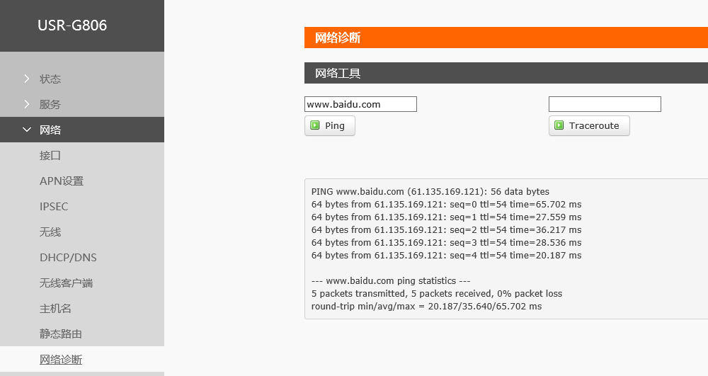 最后,登录工业4g路由器设置界面,进行网络诊断。以有人USR-G806为例,登录192.168.1.1,输入用户名和密码(默认均为root)。点击“网络”——“网络诊断”,输入网址进行ping测试。