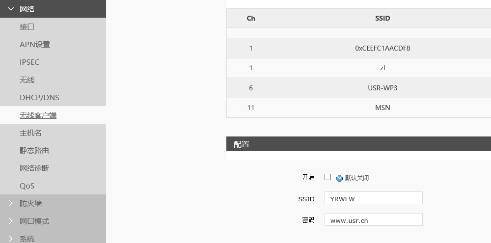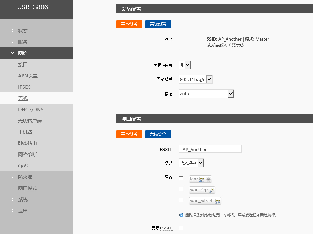 AP接口默认是开启的,需要进入到AP接口设置界面进行设置,如下图: