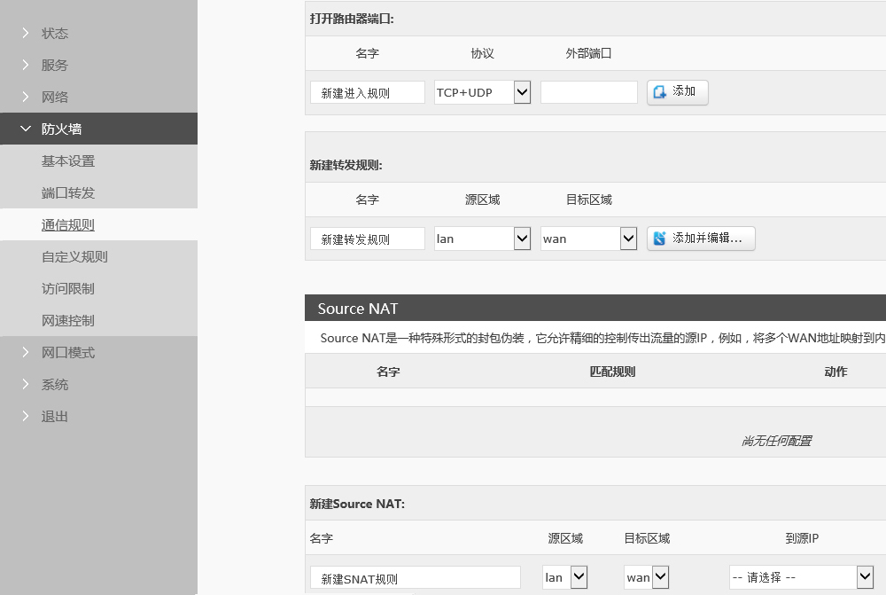 通信规则可以用来打开一些路由器端口,比如需要远程访问路由器的配置页面,可以打开80端口,远程ssh连接, 可以打开22端口。