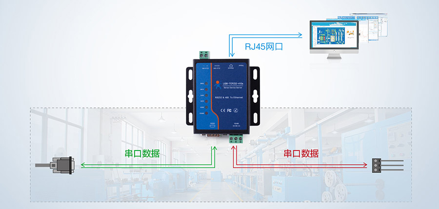 作用:串口服务器可实现串口(RS232/485/422)到以太网口的数据的双向透明传输。串口服务器内部模块自行完成协议转换。串口侧是串口电平数据,以太网口侧是网络数据包,通过简单设置即可实现联网功能。
