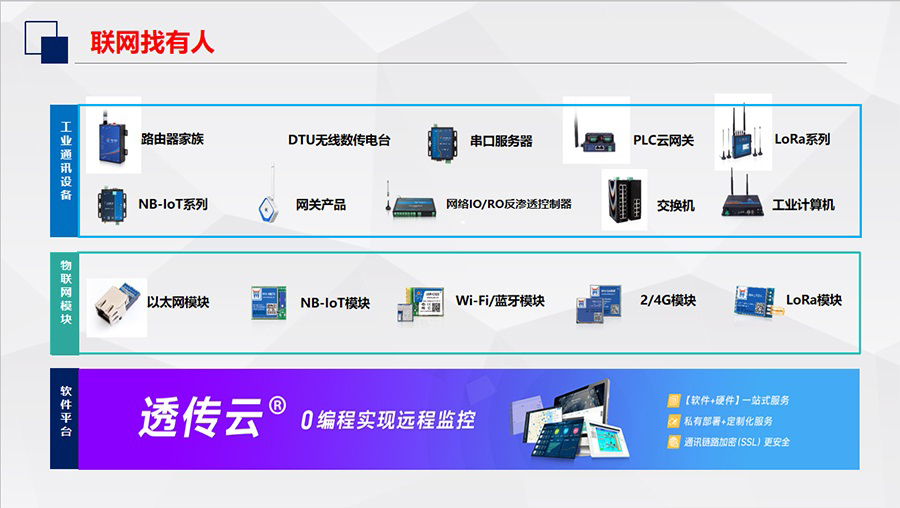公司以“有人在认真做事”为企业文化,推出4G工业路由器、串口服务器、GPRS/4G DTU、PLC云网关、网络IO、交换机、各类联网通讯模组、透传云等软硬件产品系列,在工业自动化、远程抄表、PLC联网控制、环保监控、扫码支付、移动定位、无线烟感报警等领域发挥着重要作用,立志成为工业物联网领域的生态型企业。