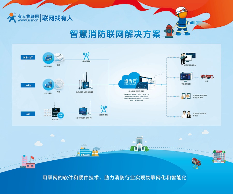 有人专注物联网消防领域多年,为智慧消防提供联网传输解决方案,助力智慧消防产业发展。根据智慧消防的实际应用场景和烟感厂家的不同需求,有人推出NB-IoT、LoRa、4G等产品,配合云端使用,为消防烟感行业提供可靠的需求定制服务。