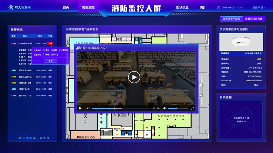 有人消防云平台可实现远程实时监控,对相关的火情信息、地点、时间、频次等内容进行多维度、报表式呈现;支持对烟感探测器的安装地点、运行状态等进行查询和展示。