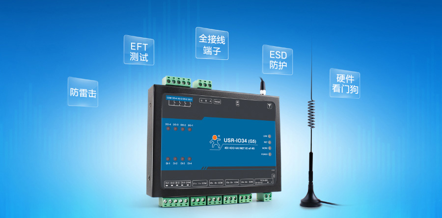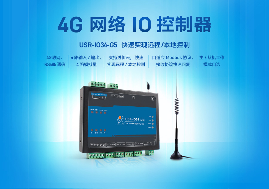 下面以4G网络IO控制器USR-IO34-G5为例,向大家介绍产品功能和特点。
