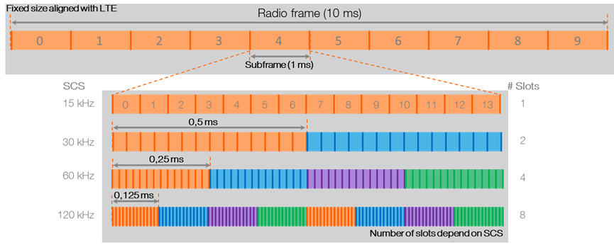 5G使用4G的无线电帧结构作为参考,该帧的持续时间为10毫秒,其中包含10个时隙,每个时隙1毫秒。在4G中,调度是基于时隙进行的,这意味着时隙是我们可以调度用户的最小粒度。增大载波之间的空间意味着在1毫秒内可以容纳多个插槽。例如,在1毫秒的时间段内,只能使用15 kHz SCS传输一个时隙;但是,2个插槽可以安装30 kHz SCS,4个插槽可以安装60 kHz SCS,甚至8个插槽可以安装120 kHz SCS。每个子帧具有更多时隙的主要优点是具有更多的调度机会,因此有更多的重传可能性,这对于提高可靠性至关重要。