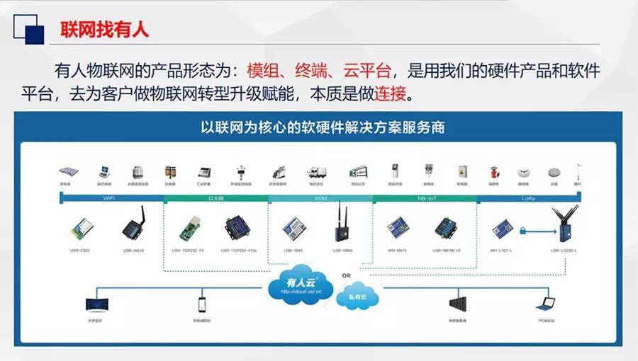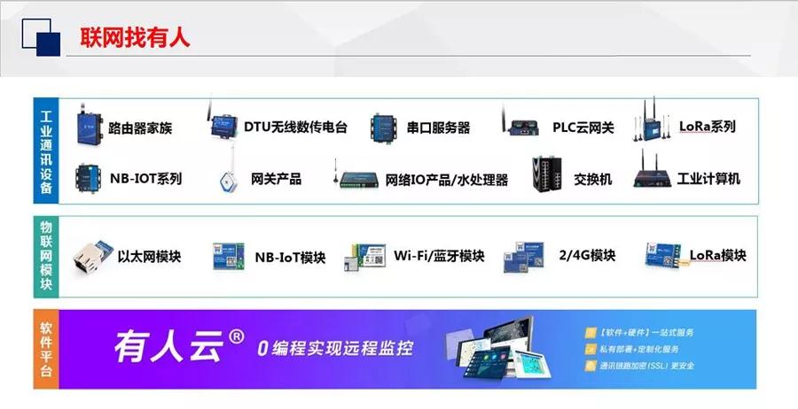 有人物联网深耕工业物联网行业多年,旗下业务涉及模块、终端、云平台等多个领域,用联网的软件和硬件技术,助力客户实现物联网化升级。