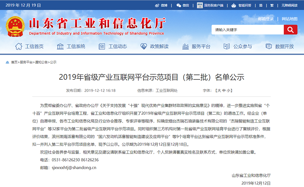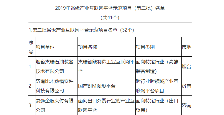 为贯彻山东省委办公厅、省政府办公厅《关于支持发展“十强”现代优势产业集群财政政策的实施意见》的精神,进一步推进实施山东“个十百”产业互联网平台培育工程,经企业(单位)自愿申报、各市工业和信息化局及行业协会推荐、专家评审等程序,山东省工业和信息化厅组织开展了2019年省级产业互联网平台示范项目(第二批)的遴选工作。