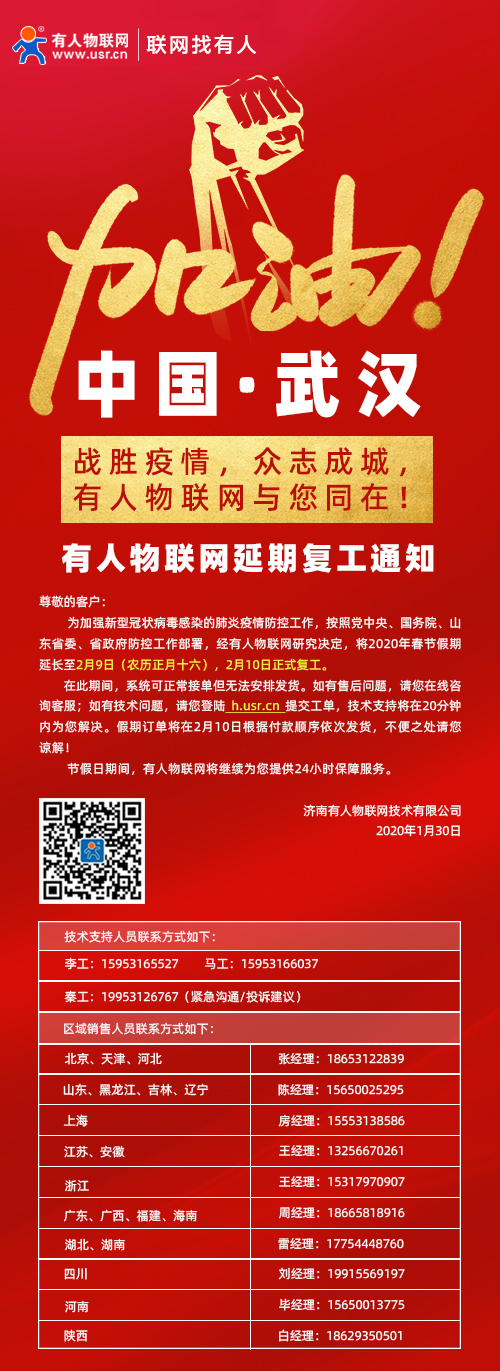 为加强新型冠状病毒感染的肺炎疫情防控工作,按照党中央、国务院、山东省委、省政府防控工作部署,经有人物联网研究决定,将2020年春节假期延长至2月9日(农历正月十六),2月10日正式复工。