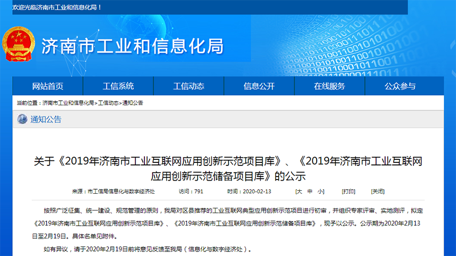 有人物联网入选2019年济南市工业互联网应用创新示范项目库