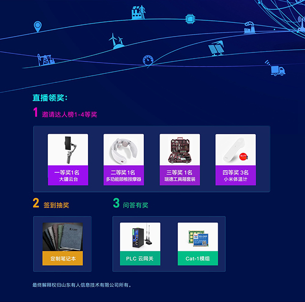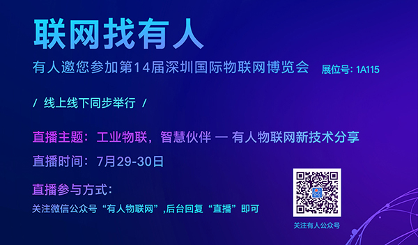 除在现场进行常规展示外,有人物联网还将开放线上直播间,为异地客户提供“云参展”服务。届时,我们将邀请重磅嘉宾带来“有人物联网新技术分享”,为大家提供“智能硬件上云服务”、“智能方案展示”、“5G/Cat-1/NB-IoT新产品介绍”等直播干货,期间好礼不断,欢迎大家参加。