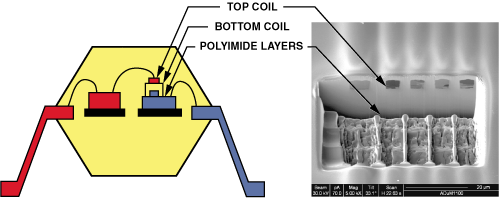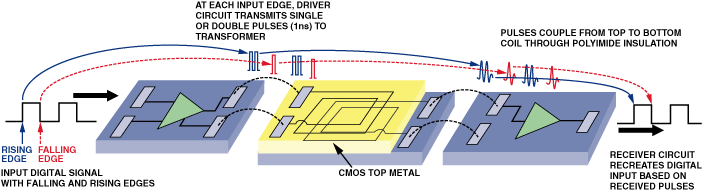 ED和光电耦合器中使用的光电二极管相比,耦合器隔离器是基于芯片级变压器磁耦合器(图2)。平面变压器使用CMOS金属层以及在钝化层上方放置的金层。金层下面的高击穿聚酰亚胺层将顶部变压器线圈与底部隔离。连接到顶部和底部线圈的高速CMOS电路提供了每个变压器及其外部信号之间的接口。晶圆级处理提供了一种在单个封装中集成多个隔离通道以及其他半导体功能的低成本方法。一世耦合器技术消除了与光耦合器相关的不确定的电流传输比,非线性传递函数以及漂移(随时间和温度变化);减少多达90%的功耗;无需外部驱动器或分立设备。