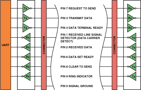 RS-232标准将设备分为两类:DCE(数据通信设备)和DTE(数据终端设备)。这些名称是其计算机和调制解调器传统的遗产。现在,这些术语仅定义了哪些线作为输入连接,哪些线作为输出连接。