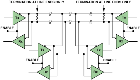 一个使功能允许司机被置于高阻抗状态; 因此,多个驱动程序可以共享一条总线而无争用。该软件协议定义了总线仲裁程序,始终使除一个驱动程序之外的所有驱动程序保持不活动状态,并允许多达32个驱动程序共享线路。半双工2线双向配置如图7所示。每个节点包含一个驱动器和接收器,所有驱动器和接收器共享同一根2线双绞线电缆。尽管这简化了安装并降低了成本,但它限制了最大吞吐率。4线全双工配置(将一个节点用作主节点,其余节点用作从节点)更复杂,但可提供更高的数据速率。