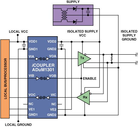 i Coupler设备的一项新颖功能是它们能够在同一封装中组合发送和接收通道。在我耦合变压器本身是双向的,所以信号可以在任一方向,只要通过如适当的电路存在于变压器的每一侧。以这种方式,为多通道隔离器提供了多种发送/接收通道配置。