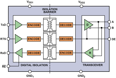 由于RS-485通常用于连接多个系统,因此每个系统与总线之间的隔离至关重要。与RS-232一样,数字隔离器也不支持RS-485标准,因此不能在收发器和电缆之间使用。而是在收发器和本地系统之间使用它们。收发器的系统端通常连接到本地总线或处理器。由于i耦合器隔离器的输入和输出电路彼此电气隔离,因此在处理器和收发器之间插入一个是将系统与电缆隔离的简单方法。为了完成隔离,使用隔离的DC-DC转换器为隔离器和收发器供电。ADuM1301 i的组合图8所示的耦合器数字隔离器和隔离式电源消除了接地环路,并提供了有效的保护,以防电涌损坏。