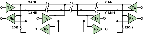 如图10所示,CAN总线使用平衡的2线差分接口,通常工作在3 V或5V。采用非归零(NRZ)编码,以最小的数量确保紧凑的消息。过渡和高抗噪性。CAN总线收发器使用一对漏极开路设备来创建CANH(V CC – 0.9 V)到CANL(1.5 V)的差分信号。当被驱动时,发射器产生占优势的信号,该信号代表逻辑低电平。当没有发送器被驱动时,上拉电阻将总线设置为V CC / 2,产生隐性信号,该信号表示逻辑高电平。一个备用控制使收发器进入低功耗模式。低功耗接收器在待机模式下保持活动状态,监视总线状态变化,并在检测到活动时发信号通知控制器激活本地节点。
